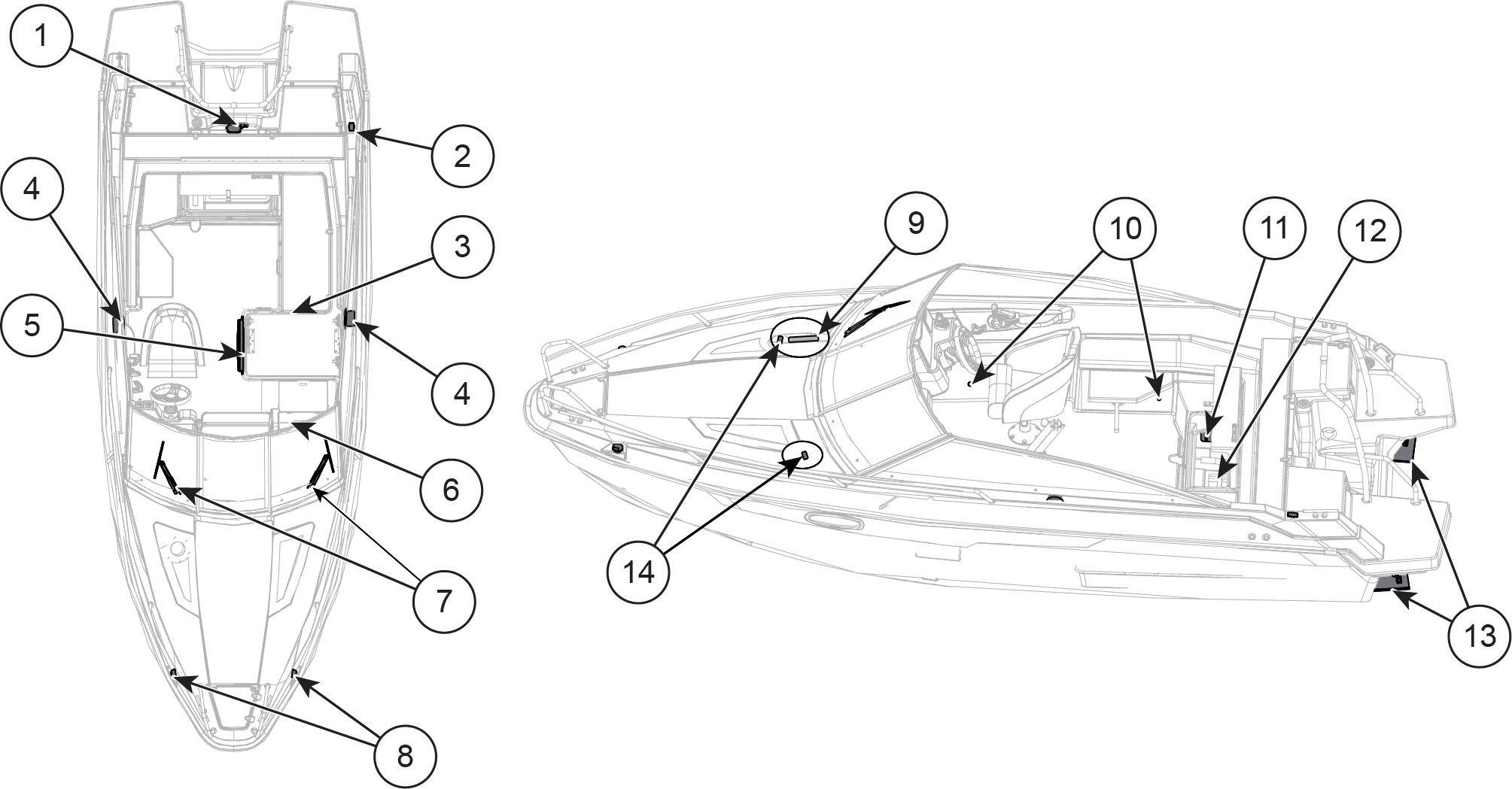 14, Éclairage de la cabine : disponible uniquement dans le Yamarin 63 DC.