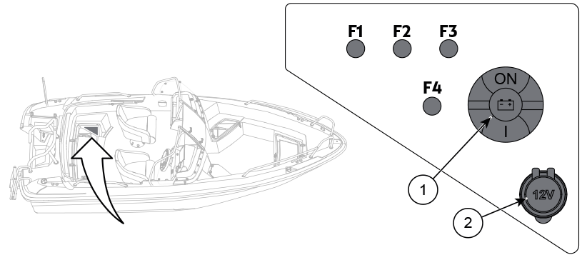 | 1 | Main switch | F2 | USB outlet/Fishfinder | 10 A | |