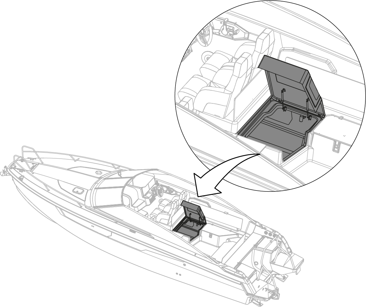 Le bateau est équipé d'une cabine intermédiaire, située sous la zone du siège du pilote. La banquette située derrière le siège du pilote sert également de panneau d'accès à la cabine. Le panneau est également équipé d'une lucarne.