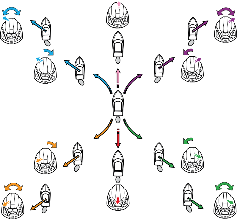 Poussez le joystick en diagonale en position de coin pour orienter la poussée du moteur dans la direction définie.