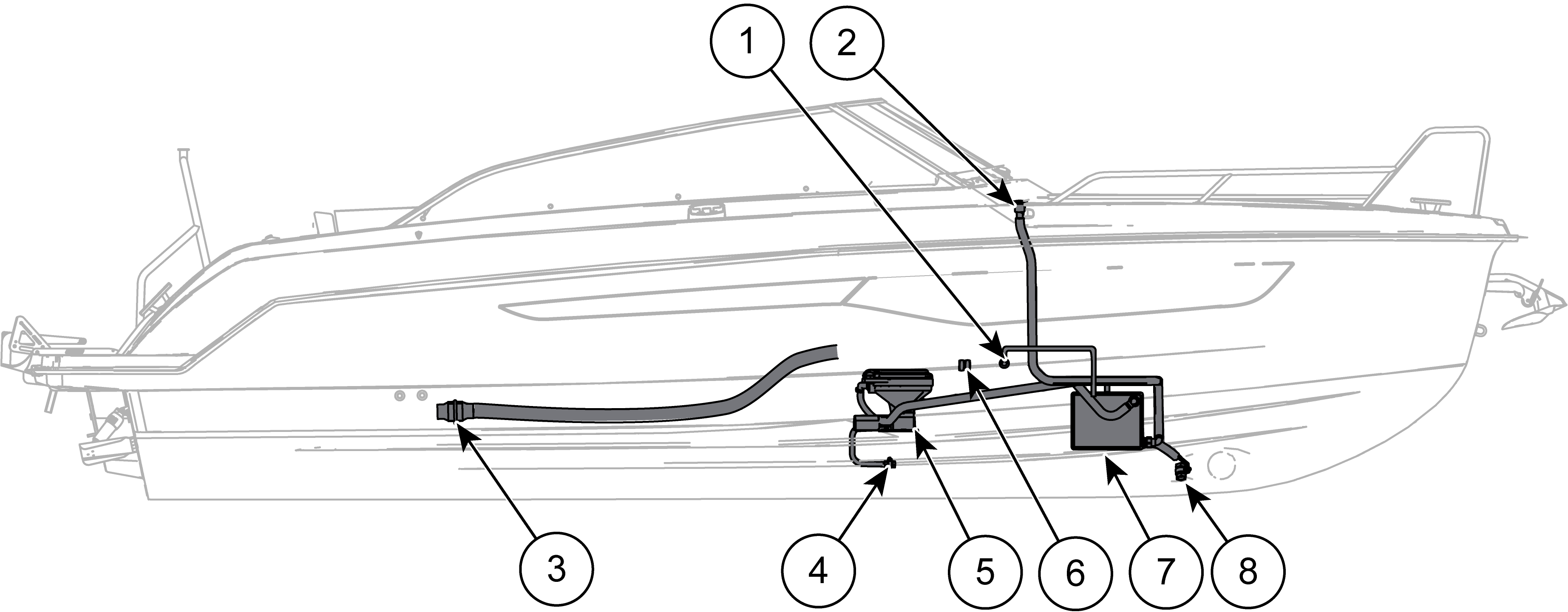 4 | Valve d'entrée de la chasse d'eau des toilettes | 8 | Vanne de vidange en mer de la fosse septique |